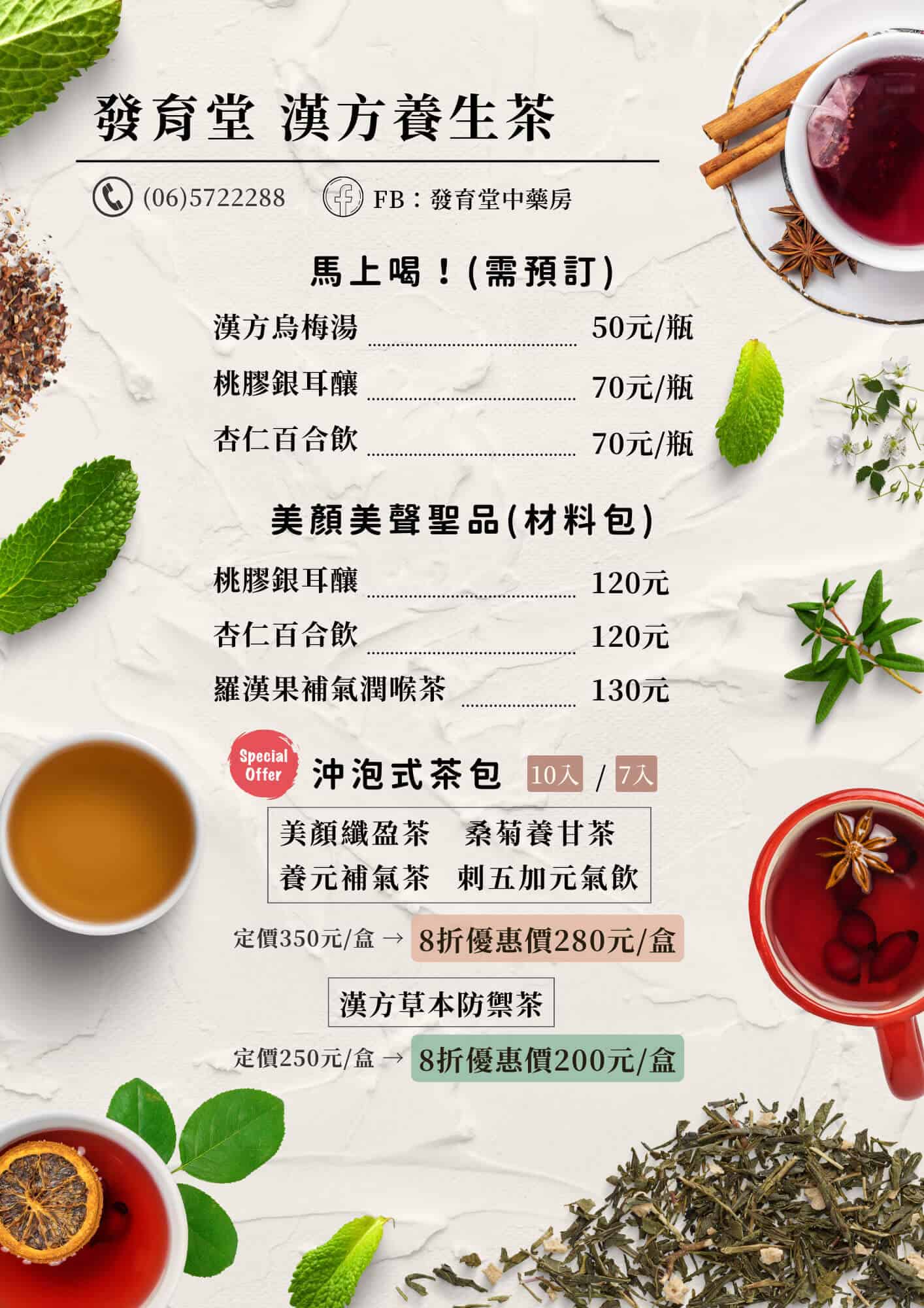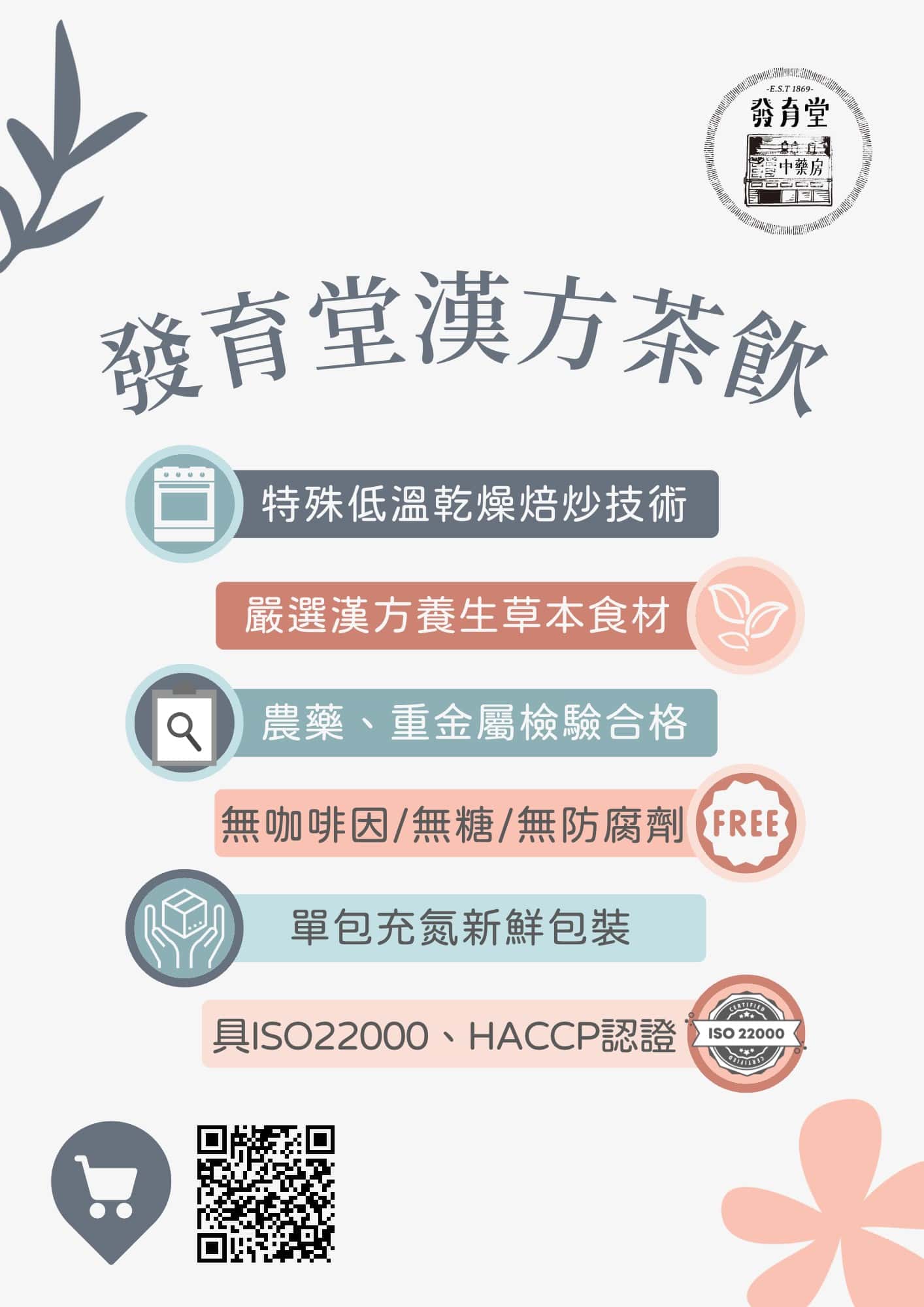 發育堂是政府核可的實體漢藥鋪,我們有天然漢方茶飲、傳統藥膳燉湯及月子